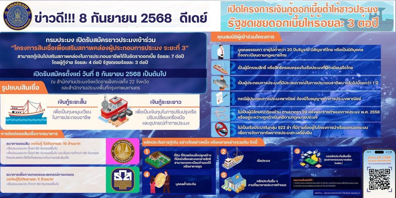 โครงการฯ นี้ได้รับการอนุมัติจากคณะรัฐมนตรีเมื่อวันที่ 19 สิงหาคม 2568 กำหนดวงเงินรวม 3,000 ล้านบาท เพื่อช่วยเหลือผู้ประกอบการประมงให้มีทุนหมุนเวียนในการประกอบอาชีพ เช่น ค่าน้ำมัน ค่าจ้างแรงงาน รวมถึงเป็นทุนปรับปรุงเรือ เครื่องมือ และอุปกรณ์การประมง เพื่อเพิ่มประสิทธิภาพและสร้างความมั่นคงยั่งยืนในการทำประมง โดยธนาคารออมสิน กรอบวงเงินสินเชื่อ 2,000 ล้านบาท สำหรับเรือประมงขนาด 60 ตันกรอสขึ้นไป วงเงินสินเชื่อสูงสุด รายละไม่เกิน 10 ล้านบาท และธนาคารเพื่อการเกษตรและสหกรณ์การเกษตร (ธ.ก.ส.) กรอบวงเงินสินเชื่อ 1,000 ล้านบาท สำหรับเรือประมงขนาดต่ำกว่า 60 ตันกรอส วงเงินสินเชื่อสูงสุด รายละไม่เกิน 5 ล้านบาท ด้วยอัตราดอกเบี้ยพิเศษร้อยละ 7 ต่อปี โดยรัฐบาลชดเชยดอกเบี้ยร้อยละ 3 ต่อปี และผู้ประกอบการประมงจริงจ่ายร้อยละ 4 ต่อปี เป็นระยะเวลา 7 ปี นับแต่วันกู้ แต่ไม่เกินระยะเวลาโครงการฯ