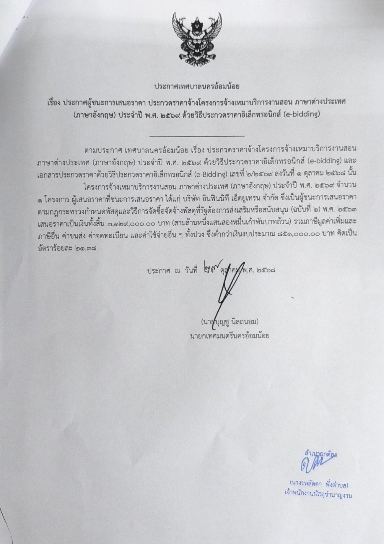 ภาพที่เกี่ยวข้อง ประกาศเทศบาลนครอ้อมน้อย เรื่อง ประกาศผู้ชนะการเสนอราคา ประกวดราคาจ้างโครงการจ้างเหมาบริการงานสอน ภาษาต่างประเทศ (ภาษาอังกฤษ) ประจำปี พ.ศ. ๒๕๖๙ ด้วยวิธีการรปะกวดราคาอิเล็กทรอนิกส์ (e-bidding)
