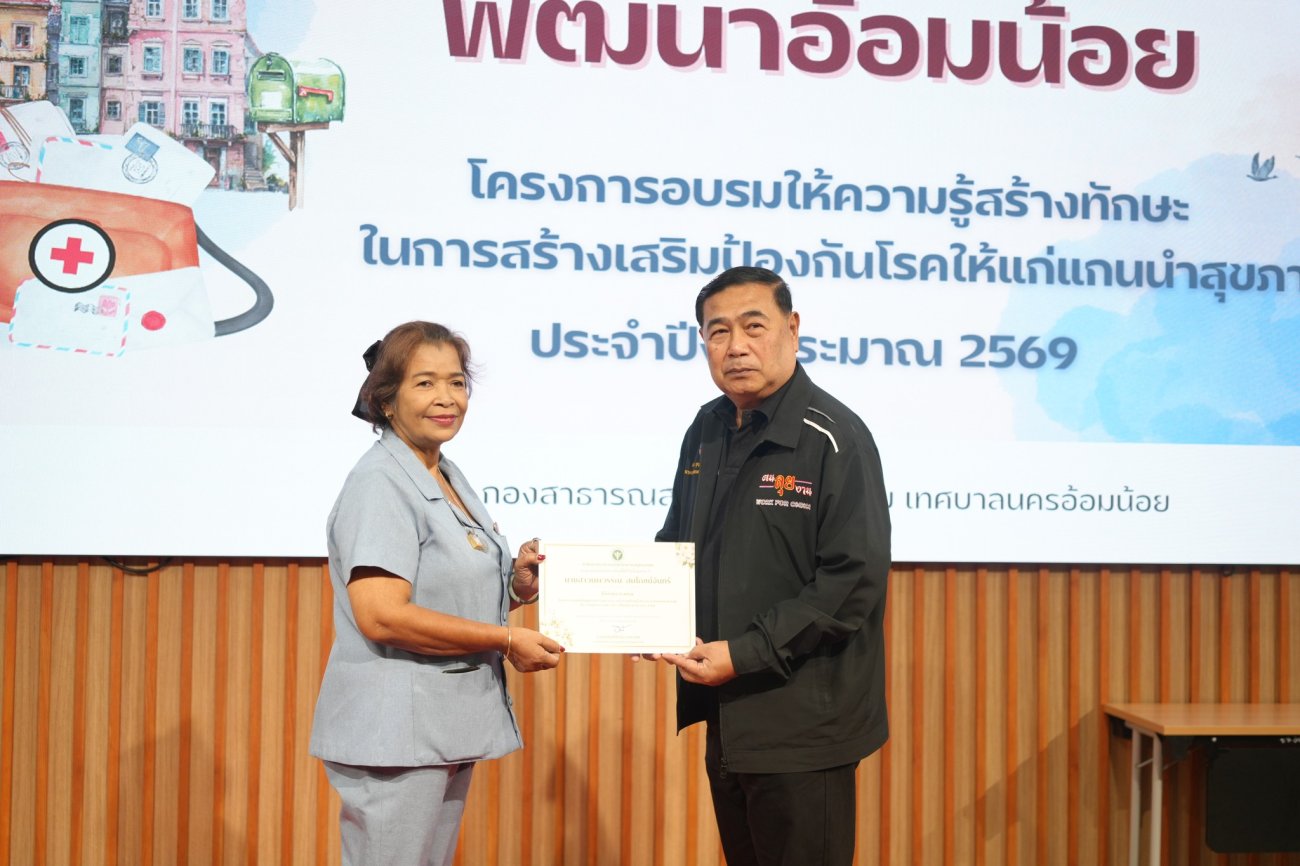 นายบุญชู นิลถนอม นายกเทศมนตรีนครอ้อมน้อย มอบหมายให้ นายสมหมาย น้อยเจริญ รองนายกเทศมนตรี เป็นประธานในการเปิดอบรม "โครงการอบรมให้ความรู้สร้างทักษะในการสร้างเสริมป้องกันโรคให้แก่แกนนำสุขภาพ ประจำปีงบประมาณ 2569" ณ ห้องประชุมภูมิพลินทร์ อาคารศูนย์พัฒนาคุณภาพชีวิต เทศบาลนครอ้อมน้อย