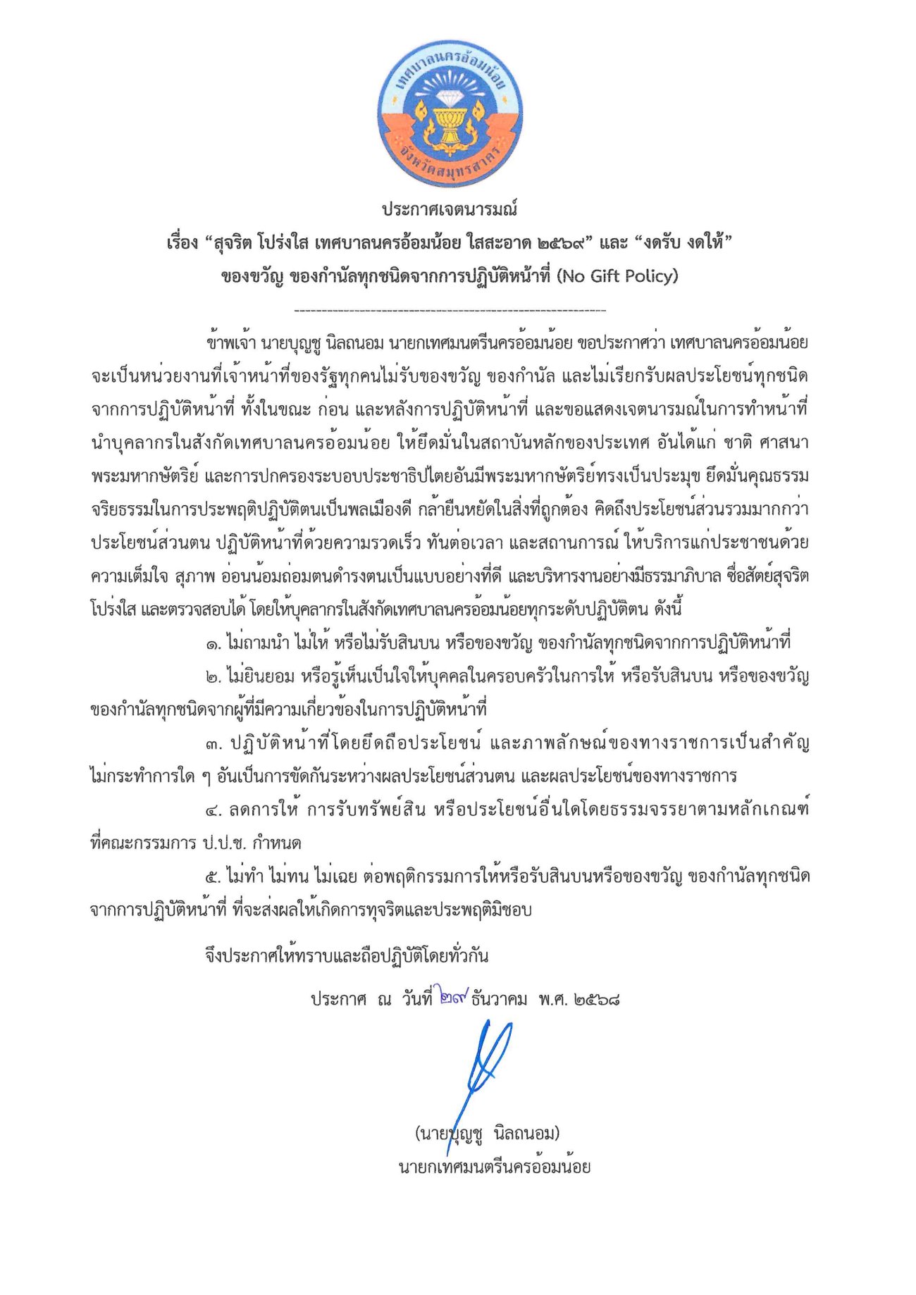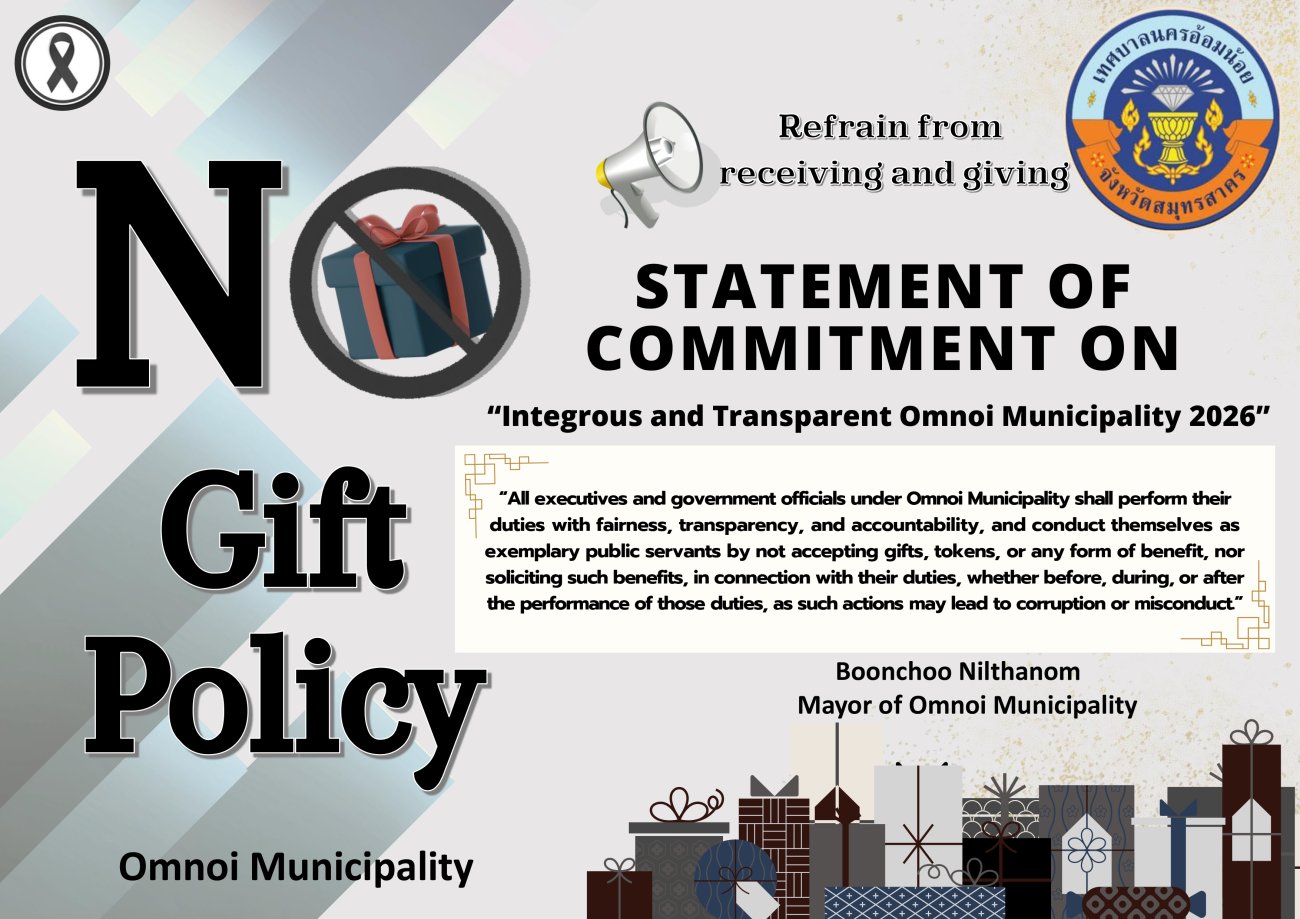 เทศบาลนครอ้อมน้อย ประกาศเจตนารมณ์ เรื่อง "สุจริต โปร่งใส เทศบาลนครอ้อมน้อย ใสสะอาด 2569" และ "งดรับ งดให้" ของขวัญ ของกำนัลทุกชนิดจากการปฏิบัติหน้าที่ (No Gift Policy)