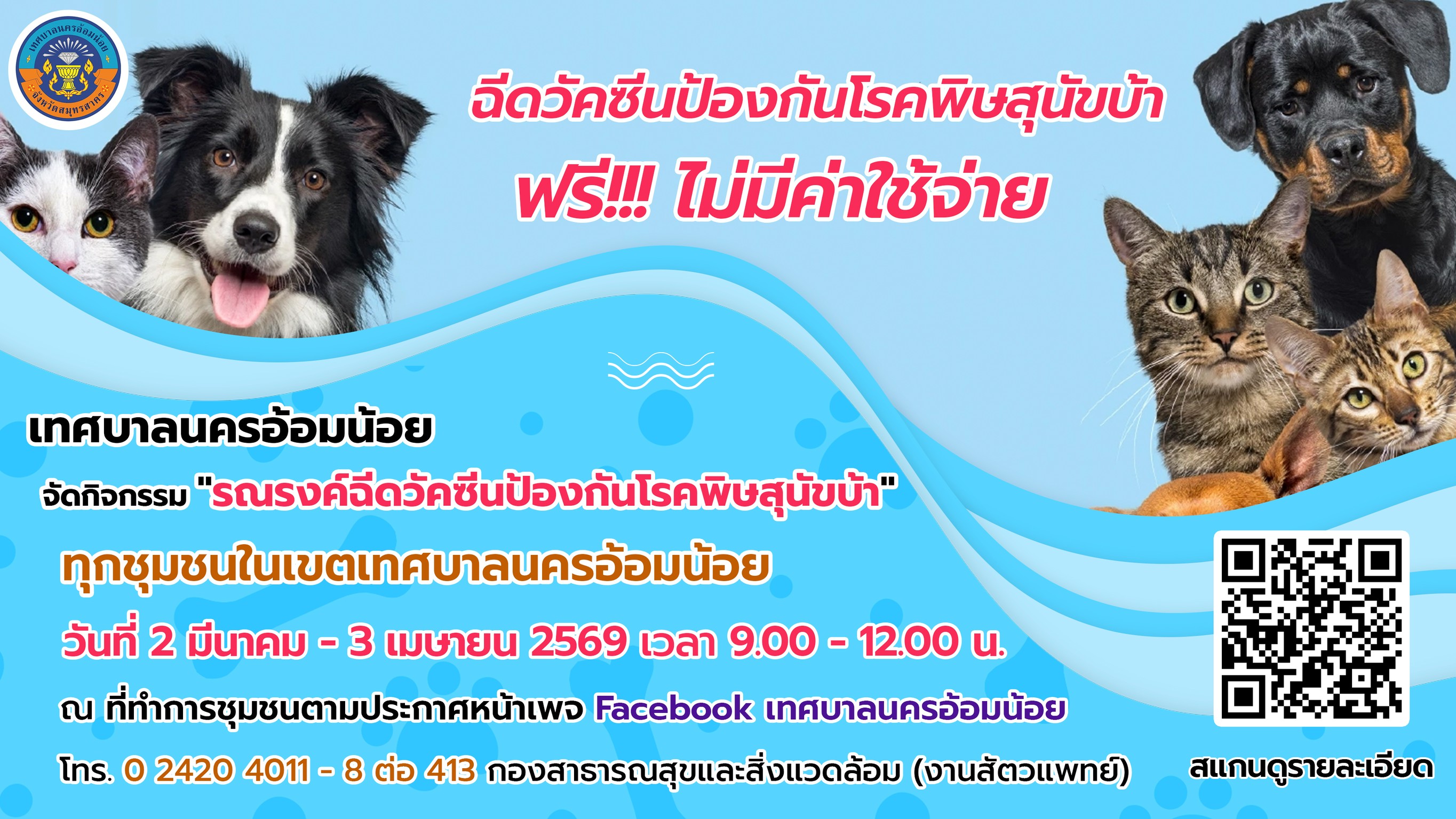 เทศบาลนครอ้อมน้อย จัดกิจกรรม "รณรงค์ฉีดวัคซีนป้องกันโรคพิษสุนัขบ้า" ขอเชิญชวนประชาชน นำสุนัขและแมวของท่าน เข้ารับบริการฉีดวัคซีนป้องกันโรคพิษสุนัขบ้า ระหว่างวันที่ 2 มีนาคม ถึง 3 เมษายน 2569 เวลา 9.00 - 12.00 น.